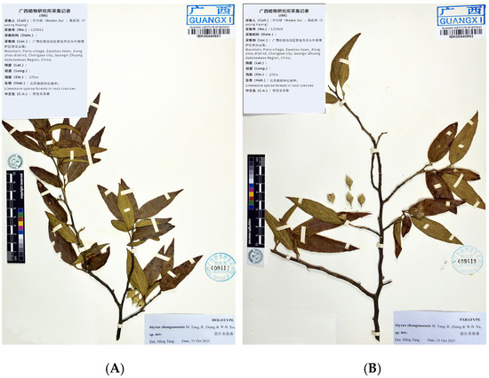 Holotype (A) and paratype (B) sheets of Styrax chongzuoensis. Tiandeng hill, Pairu village, Zuozhou town, Chongzuo city, Guangxi Zhuang Autonomous Region, China. WB Xu & YS Huang CZ0921 (holotype, IBK!), CZ0928 (paratype, IBK!).