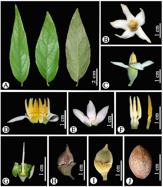 Styrax chongzuoensis. (A) Leaf blade; (B) flower (apical view); (C) flower (lateral view); (D) opened corolla plus androecium (ventral view); (E) opened corolla (abaxial view); (F) stamens; (G) pistil; (H) fruit (ripe); (I) fruit (immature); (J) seed. Photographed by Weibin Xu.