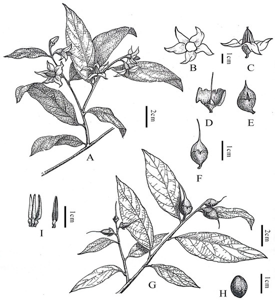 Line drawing of Styrax chongzuoensis. (A) Flowering branch; (B) corolla; (C) flower (lateral view); (D) sepals and stigma; (E) mature fruit; (F) fruit; (G) fruiting branches; (H) seed; (I) stamen. Illustration by Guoxing Peng based on living field-collected material.