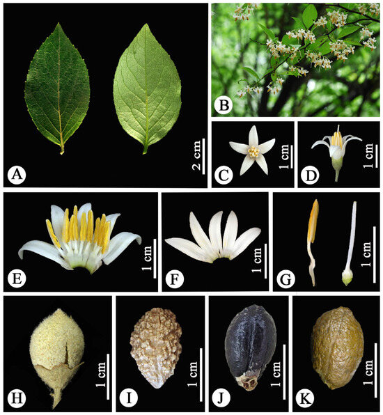 Styrax fortune. (A) Leaf blades; (B) inflorescence; (C) flower (apical view); (D) flower (lateral view); (E) opened corolla plus androecium (ventral view); (F) corolla lobes; (G) stamens (left) and pistil (right); (H) fruit; (I) seed (with tuberculous projection; lateral view); (J) seed (black; lateral view); (K) seed (brown; lateral view). Photographed by Rui Zhang.