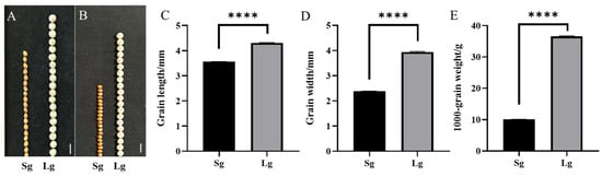 The two accessions, Lg and Sg, showed significant differences in grain size (Figure 1A,B). The grain length of Sg and Lg was 3.56 ± 0.01 mm and 4.30 ± 0.03 mm, respectively, with the grain length of Lg being 1.22-fold greater than that of Sg. The grain width of Sg was 2.39 ± 0.01 mm, whereas that of Lg was 3.94 ± 0.03 mm, representing a 1.65-fold increase relative to Sg. (Table S2). The grain length of Lg was about 14 mm higher than Sg, and the grain width was about 21 mm higher than Sg. It means the grain length and width of Lg were about 20% and 40% higher than Sg, respectively (Figure 1A,B). Statistical analysis showed that there were significant differences between the two accessions in grain length, grain width, and 1000-grain weight (Figure 1C–E).