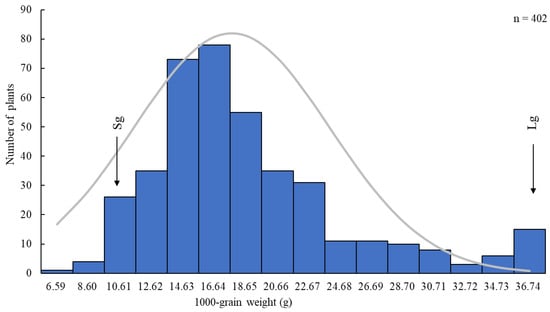 Frequency distribution of the 1000-grain weight in the Lg (large-grain) × Sg (small-grain) F2 population.