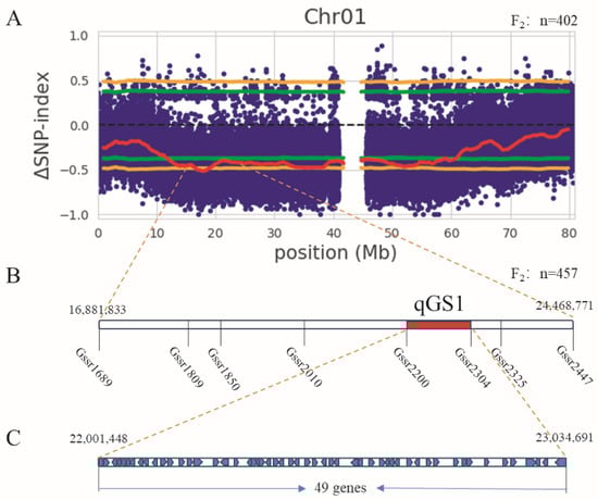 3.3. BSA Sequencing Analysis and Fine Mapping of qGS1