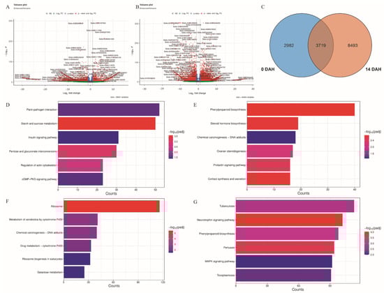 Differential gene expression and pathway enrichment analyses. (A) Volcano plot of differentially expressed genes (DEGs) between Sg and Lg at 0 days after heading (DAH). (B) Volcano plot of DEGs between Sg and Lg at 14 DAH. (C) Venn diagram showing the number of DEGs identified at 0 and 14 DAH, including their overlap. (D) KEGG pathway enrichment analysis of downregulated DEGs at 0 DAH. (E) KEGG pathway enrichment analysis of upregulated DEGs at 0 DAH. (F) KEGG pathway enrichment analysis of downregulated DEGs at 14 d DAH. (G) KEGG pathway enrichment analysis of upregulated DEGs at 14 DAH.