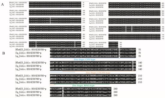 The sequence analysis of Sobic.001G230700. (A) Comparative analysis of nucleotide sequences (CDS region) was conducted for Sobic.001G230700 across three genotypes: BTx623, Sg, and Lg. (B) Comparative analysis of protein sequences was conducted for Sobic.001G230700 across three genotypes: BTx623, Sg, and Lg. Zinc finger, CHY-type: 3–92. Zinc finger, CTCHY-type: 81–145. Zinc finger, RING-type: 144–189.