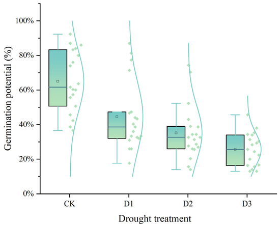 Effects of different CK, D1, D2, and D3 treatments at different concentrations of PEG-6000 0%, 15%, 20%, and 25% on the germination potential of sorghum seeds. The dots in the figure indicate the germination potential, and the lines indicate the distribution pattern of the 19 varieties under different drought stress.