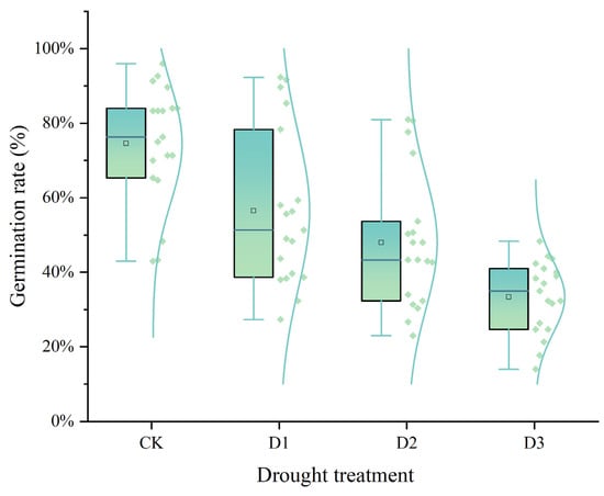 Effects of different CK, D1, D2, and D3 treatments at different concentrations of PEG-6000 0%, 15%, 20%, and 25% on the germination rate of sorghum seeds. The dots in the figure indicate the germination rate, and the lines indicate the distribution pattern of the 19 varieties under different drought stress.