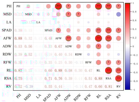 Single drought tolerance correlation analysis of sorghum varieties for each attribute. The notes * and ** in the figure indicate statistical differences at the 0.05 and 0.01 probability levels. PH, plant height; SD, stem diameter; LA, leaf area; AFW, above-ground fresh weight; ADW, above-ground dry weight; RFW, root fresh weight; RDW, below-ground dry weight; SPAD, relative chlorophyll content; RSA, total root surface area; RL, total root length; RV, total root volume.