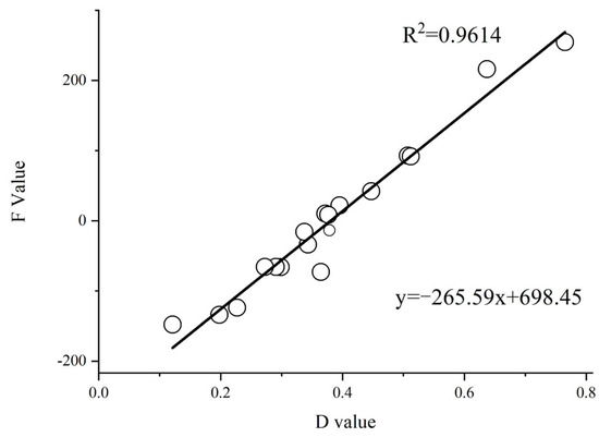 Correlation analysis was conducted between the (D) values and (B) values, as well as between the (D) values and (F) values. A significant positive correlation between the (D) values and (F) values (R2 = 0.9614; p < 0.01) was observed, indicating that the two evaluation methods are feasible and consistent (Figure 4 and Figure 5). Subsequently, a systematic cluster analysis was performed using the (D) values and (F) values, categorizing the 19 sorghum varieties into three distinct groups: