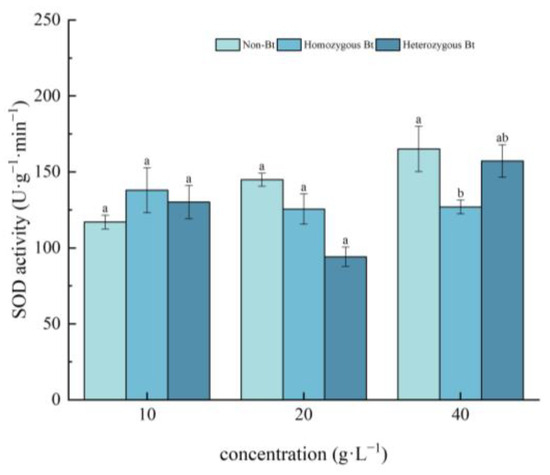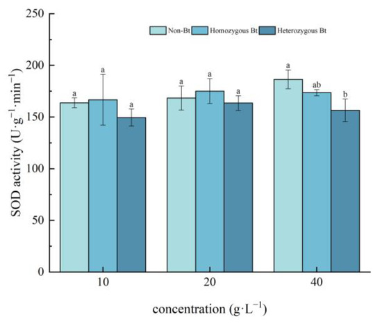 Figure 1. The effect of Bt rice straw extracts on SOD activity in the leaves of pakchoi seedlings. Values within the same column sharing the same letter indicate no significant difference (p > 0.05), whereas different letters denote a significant difference (p < 0.05). “Non-Bt” refers to the straw of non-Bt rice; “Homozygous Bt” refers to the straw of homozygous Bt rice; “Heterozygous Bt” refers to the straw of heterozygous Bt rice.