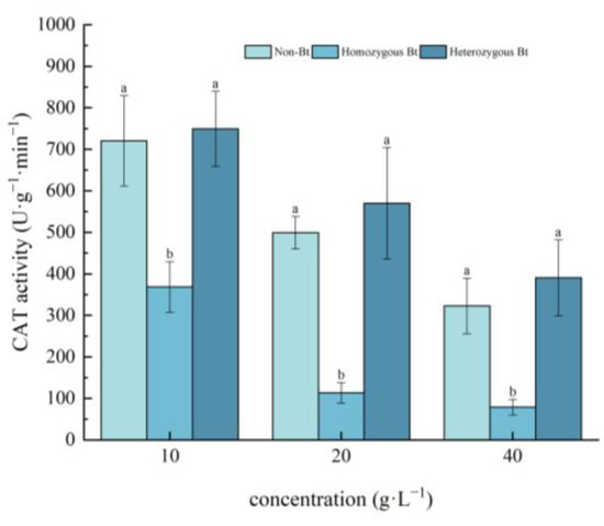 Figure 3. The effect of Bt rice straw extracts on CAT activity in the leaves of pakchoi seedlings. Values within the same column sharing the same letter indicate no significant difference (p > 0.05), whereas different letters denote a significant difference (p < 0.05). “Non-Bt” refers to the straw of non-Bt rice; “Homozygous Bt” refers to the straw of homozygous Bt rice; “Heterozygous Bt” refers to the straw of heterozygous Bt rice.
