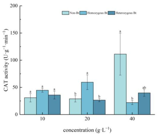 As shown in Figure 3, CAT activity in the leaves of pakchoi seedlings decreased with increasing extract concentration. Compared to the non-Bt rice straw extract, the homozygous Bt rice straw extract at concentrations of 10, 20, and 40 g·L−1 significantly inhibited CAT activity in the leaves, with inhibition rates of 48.86%, 77.29%, and 75.61%, respectively. In contrast, the heterozygous Bt rice straw extract had no significant effect on CAT activity in the leaves of pakchoi seedlings.