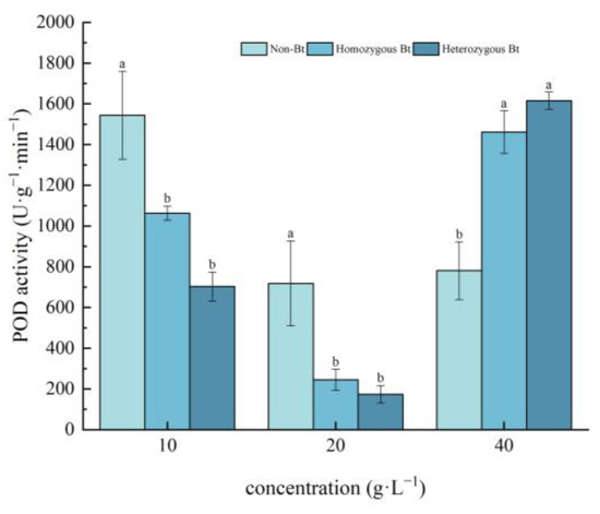 Different rice straw extracts had varying effects on POD activity in the leaves and roots of pakchoi seedlings (Figure 5 and Figure 6). As shown in Figure 5, compared to the non-Bt rice straw extract, the homozygous Bt rice straw extracts at 10 g·L−1 and 20 g·L−1 significantly inhibited POD activity in the leaves of pakchoi seedlings, with inhibition rates of 31.16% and 54.48%, respectively. However, the homozygous Bt rice straw extract at 40 g·L−1 significantly enhanced POD activity in the leaves, with an increase of 46.56%. Similarly, the heterozygous Bt rice straw extracts at 10 g·L−1 and 20 g·L−1 significantly suppressed POD activity in the leaves, with inhibition rates of 65.90% and 75.56%, respectively. In contrast, the 40 g·L−1 heterozygous Bt rice straw extract significantly increased POD activity in the leaves, with a growth rate of 51.66%.