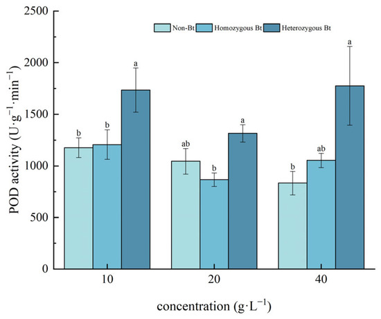 Figure 5. The effect of Bt rice straw extracts on POD activity in the leaves of pakchoi seedlings. Values within the same column sharing the same letter indicate no significant difference (p > 0.05), whereas different letters denote a significant difference (p < 0.05). “Non-Bt” refers to the straw of non-Bt rice; “Homozygous Bt” refers to the straw of homozygous Bt rice; “Heterozygous Bt” refers to the straw of heterozygous Bt rice.