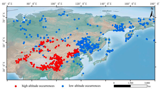 The distribution data for H. vulgaris were primarily obtained from the Global Biodiversity Information Facility (GBIF, http://www.gbif.org/, accessed on 27 November 2023), the Chinese Virtual Herbarium (CVH, http://www.cvh.ac.cn/, accessed on 28 November 2023) and the iPlant Species Information System (iPlant, http://www.iplant.cn/, accessed on 30 November 2023), supplemented with relevant domestic and international research and field investigations. We verified the occurrence records of H. vulgaris, and records not located in Asia were excluded. To eliminate sampling bias, the obtained distribution points were organized into a CSV file format by species name, longitude, and latitude and then imported into ArcMap 10.6 to overlay with the environmental variables used. Distribution data outside the range of the environmental variables were removed. To minimize the interference of spatial autocorrelation in model construction, the distribution data were filtered using the Wallace platform in R 4.2.2 [24], ensuring that only one occurrence point was retained within each 2.5 min × 2.5 min grid cell [25,26]. Ultimately, 800 valid distribution records of H. vulgaris across the Asian continent were obtained. Based on elevation, distribution points above 1000 m were defined as high-altitude occurrences, resulting in 396 valid points, while those below 1000 m were defined as low-altitude occurrences, yielding 404 valid points (Figure 1).