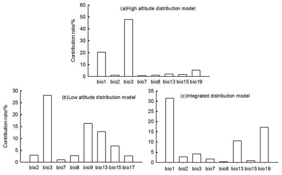 The environmental data were first transformed into the ASC format required for the MaxEnt model. To avoid multicollinearity caused by the 19 bioclimatic variables and overfitting the model, multiple linear correlation analysis was conducted on the environmental variables used by the model, and the correlation coefficient between environmental variables combined with the contribution rate of environmental variables was used as the basis for screening [28,29]. The “Band Collection Statistics” tool in ArcMap 10.6 was used to analyze the correlation of the 19 environmental variables, and an absolute value of the correlation coefficient |r| of > 0.8 was selected as the standard for a strong correlation between environmental variables. Then, the 19 environmental variables were imported into the MaxEnt model for the trial run, and environmental variables with higher contribution rates were retained when the absolute value of the correlation coefficient |r| was > 0.8. By these methods, eight bioclimatic variables—bio1, bio2, bio3, bio7, bio8, bio13, bio15, and bio19—were selected for use in the integrated distribution model and the high-altitude distribution model, while bio2, bio3, bio7, bio8, bio9, bio13, bio15, and bio17 were selected for use in the low-altitude distribution model.