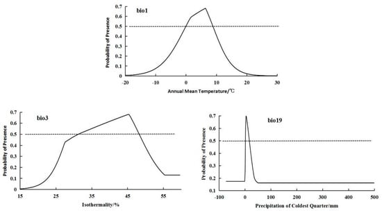 For the high-altitude distributed population, the bioclimatic variables with significant impacts on distribution were bio3 (isothermality), bio1 (annual mean temperature), and bio19 (precipitation of coldest quarter) (Figure 2). The high-altitude-distributed population showed a relatively suitable range of isothermality from 31.25 to 41.8, a suitable annual mean temperature range from −0.02 to 8.84 °C, and a suitable precipitation of coldest quarter range from 2.32 to 16.24 mm. The response curves of the high-altitude-distributed population to these three bioclimatic variables all exhibited a “unimodal” pattern, initially increasing and then decreasing (Figure 3).