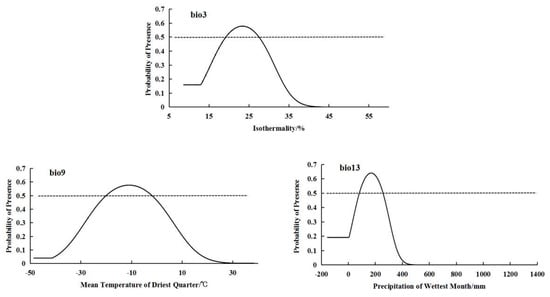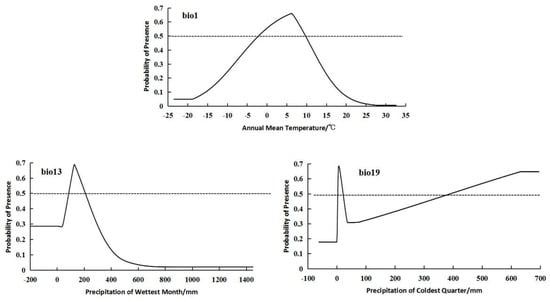 For the integrated distribution population, the bioclimatic variables with significant impacts on distribution were bio1 (annual mean temperature), bio13 (precipitation of wettest month), and bio19 (precipitation of coldest quarter) (Figure 2). The integrated distribution population showed a relatively suitable annual mean temperature range from −2.12 to 9.72 °C, a suitable precipitation of wettest month range from 87.92 to 207.23 mm, and a suitable precipitation of coldest quarter range from 2.78 to 20.224 mm and from 389.56 to 695.2 mm (Figure 5).