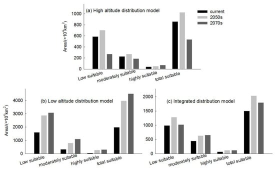 The AUC values for the high-altitude distribution model, low-altitude distribution model, and integrated distribution model were 0.919, 0.797, and 0.799, respectively, indicating excellent or good levels and suggesting that the models were effective in simulating suitable habitats for H. vulgaris.