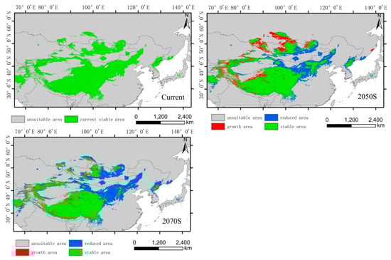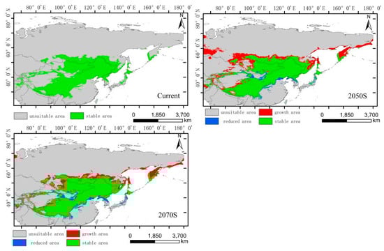 3.2. Distribution and Trends of Potential Suitable Habitats
