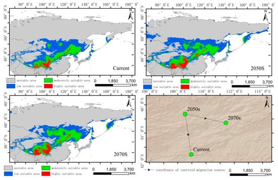 The threshold for delineating unsuitable and suitable habitats was set at the 10th percentile training presence logistic mean value (0.3) after 10 runs. To facilitate display, we categorized the distribution maps for different periods into different levels, following the classification system for assessing likelihood in the Sixth IPCC Report. We designated regions with a species occurrence probability of 0.7–1 as high-suitability areas, 0.5–0.7 as medium-suitability areas, 0.3–0.5 as low-suitability areas, and below 0.3 as unsuitable areas [34,35]. For each distribution model, the suitable habitat distribution areas were calculated for different periods. Reclassification was then performed to generate change distribution maps and centroid migration maps for these periods.