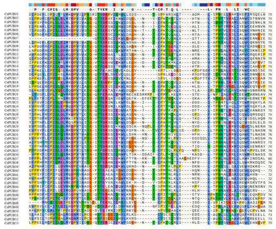Comparative analysis of U-box sequences in CsPUBs. A comparative analysis of the U-box domain of CsPUB proteins with color-coding highlighting their attributes and conservation. Color legend: The conservation gradient (top) ranges from warm tones (high conservation) to cool tones (low conservation). Amino acid properties are indicated by: blue—hydrophobic, green—polar, red—basic, purple—acidic, teal—aromatic; residues with undefined properties retain default coloring.