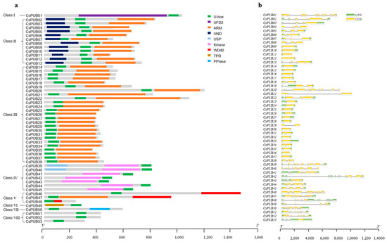 Analysis of conserved domains and gene structures of the PUB family in cucumber. (a) Nine conserved domains are delineated using different colors, with green representing the U-box domain. (b) The coding sequence region (CDS) and untranslated region (UTR) are represented in yellow and green, respectively, with black lines indicating intron regions.