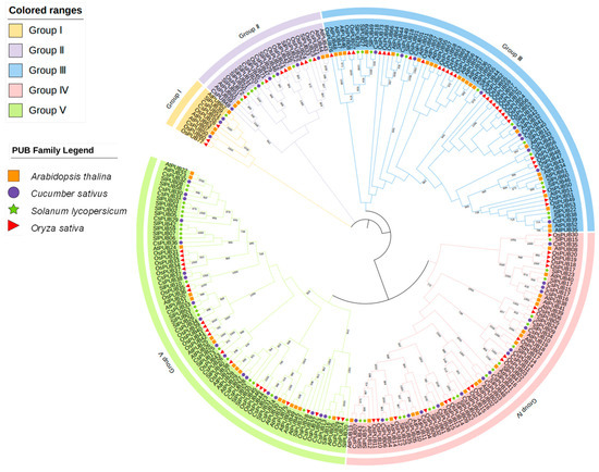 To elucidate the evolutionary relationships among CsPUB genes and assess the evolutionary trajectory of this protein family, we employed ClustalW to conduct a multiple sequence alignment and then constructed a CsPUB proteins tree in Mega-7 based on the PUB proteins from cucumber (53 members), Arabidopsis (64 members), rice (77 members) and tomato (62 members) (Figure 3). According to the PUB proteins tree, CsPUBs are classified into five major subfamilies. Additionally, we constructed a separate evolutionary tree using highly conserved U-box domain sequences (Figure S1). However, the resulting evolutionary relationships markedly differed from those of the full-length CsPUB sequences, suggesting non-collinear evolution between the U-box domain and other regions.