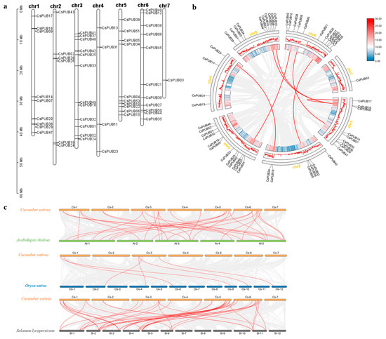 Chromosome analysis and collinearity analysis of the CsPUB family members. (a) Localization of CsPUB on chromosomes. The scale represents equal segments of cucumber chromosomes in megabases (Mb). (b) Collinearity analysis between CsPUBs in the whole cucumber genome. Red lines indicate genes with high homology, and the chromosome numbers are displayed on the outer side. Blue and red represent the gene density of the chromosomes, with the density increasing from blue to red. (c) Synteny analysis between cucumber (C. sativus) and Arabidopsis (A. thaliana), rice (O. sativa), or tomato (S. lycopersicum). Gray lines represent collinear relationships of all genes between the species pairs, while red lines indicate synteny among members of the PUB gene family.