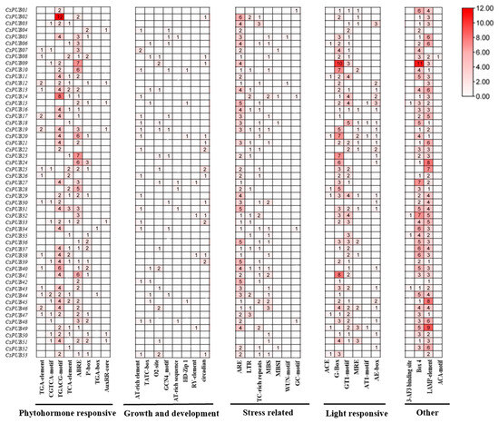 Analysis of cis-acting elements in CsPUBs. The cis-acting element analysis of CsPUBs is mainly divided into five major categories: plant hormone responsiveness, growth and development-related, biotic and abiotic stress-related, light responsiveness, and some other elements. The numerical values in the upper right corner indicate statistical counts of cis-elements, with color intensity scaled proportionally to the count magnitude (darker hues = higher counts).