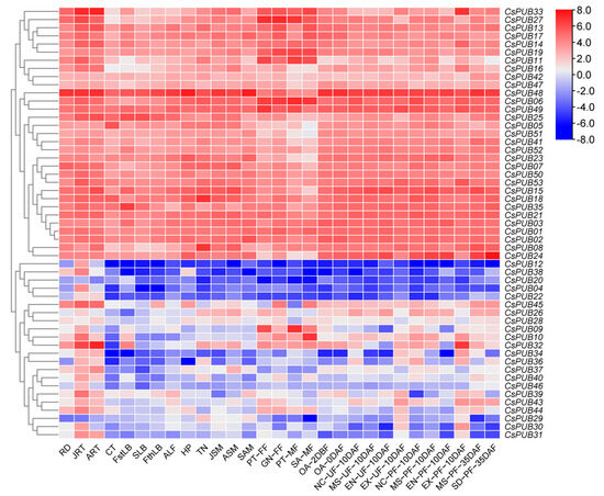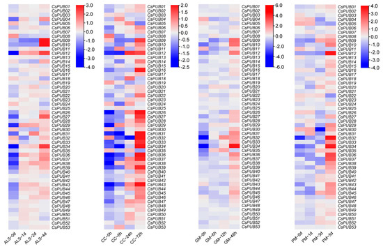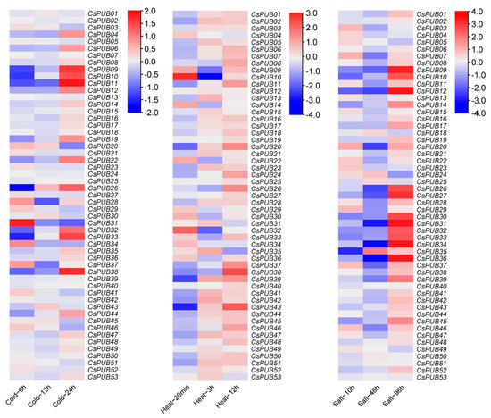 Heatmap of expression patterns for 53 CsPUB under different abiotic stress treatments (cold, heat, and salt). Red indicates upregulation of gene expression, while blue indicates downregulation of gene expression.