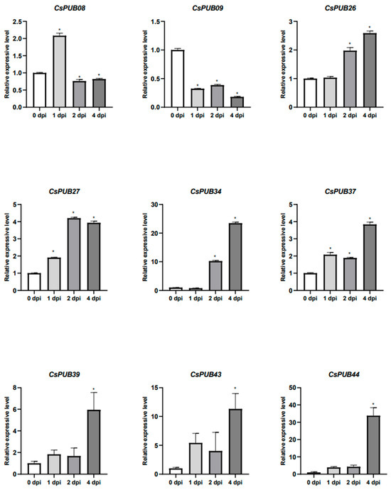 Expression analysis of CsPUB08, CsPUB09, CsPUB26, CsPUB27, CsPUB34, CsPUB37, CsPUB39, CsPUB43, and CsPUB44, after Pseudomonas syringae pv. lachrymans (Psl) treatment. Four-week-old cucumber seedlings were treated with Psl, and leaves were collected at 0, 1, 2, and 4 days after inoculation (dpi). UBQ was used as the internal reference gene to quantitatively analyze the transcription level of CsPUB through RT-qPCR. Significant differences between 0 dpi and other time points are indicated by asterisks (* p < 0.05).