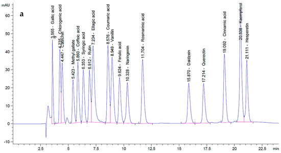 P. ovata leaf extracts obtained via SFE at 40 °C and 80 °C were analyzed by HPLC in comparison with standard polyphenolic compounds and revealed a total of 18 distinct components across the two extracts, each present at varying concentrations (Figure 2). In the chromatogram of the polyphenol standards (Figure 2a), each compound exhibited distinct retention times and peak areas, serving as references for compound identification in the extracts. The chromatograms of the P. ovata leaf extracts at 40 °C (Figure 2b) and 80 °C (Figure 2c) displayed multiple peaks, corresponding to various polyphenols, with differences in both retention time and peak area.
