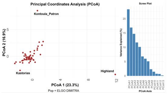The PCoA effectively demonstrated a distinct genetic structure. The distinct positioning of the genotypes ‘Highland’, ‘Kontoula_Patron’, and ‘Kastorias’ outside the central cluster highlights their genetic divergence, further supporting the identification of separate evolutionary processes among different pear species, indicating that certain cultivars may have unique genetic backgrounds [30].