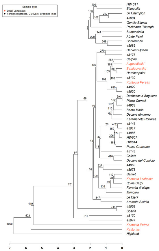 Unweighted Pair Group Method with Arithmetic Mean (UPGMA) dendrogram illustrating the genetic relationships among 51 pear (Pyrus communis L.) accessions based on SSR marker data. The branches with red color represent the Greek local landraces. The dendrogram was constructed using Euclidean genetic distances derived from standardized multilocus genotypic data. Bootstrap values and a scale bar are also shown.