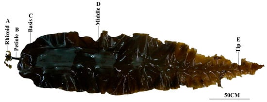 Saccharina japonica sporophytes (Sanhai, cultivated species, 150–200 cm) were collected from Xiapu, Fujian Province, China (119°92′ E, 26°56′ N), in late March 2024. Five parts of S. japonica were selected, the rhizoid (R), petiole (P), basis (B), middle (M), and tip (T) (Figure 1), with three biological replicates for each part sampled. After harvesting, the samples were washed and wiped clean, immediately frozen in liquid nitrogen, and placed in a −80 °C cryogenic refrigerator for storage.