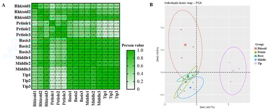 A total of 24 phytohormones were detected from methanol extracts of different parts (R, P, B, M, and T) of S. japonica using HPLC-MS/MS (Table 2). A good coincidence was obviously observed in the chromatography peaks among three repeated samples in both modes (Figure S1). A Pearson correlation analysis further indicated good consistency in the repeated samples (85% coefficient > 0.83, Figure 2A). However, the coefficients between each pair of rhizoids, petioles, basis, middles, and tips were mostly less than 0.8. A principal components analysis (PCA) indicated good consistency within each group and significant differences between the groups (Figure 2B).