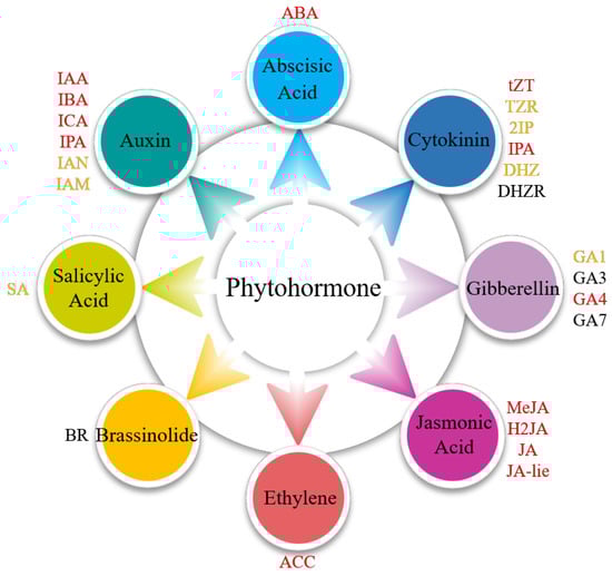 Phytohormones are a class of organic compounds produced by plants, which play important fundamental regulatory roles in growth and development []. Nine main groups of plant hormones have been reported to date, namely, abscisic acid (ABA), auxin (Aux/IAA), brassinosteroids (BR), cytokinin (CTK), ethylene (ETH), gibberellin (GA), jasmonate acid (JA), salicylic acid (SA), and strigolactone (SL) [,]. Phytohormones can induce positive growth effects on treated plants in very small concentrations []. They are involved in the regulation of plant rooting, germination, flowering, fruiting, dormancy, and other life processes and have complex physiological effects on the division, differentiation, and elongation of plant cells [,]. Algae share many similarities with higher plants regarding phytohormones [,]. For example, Sargassum horneri contains large amounts of phytohormones, including Aux/IAA, indolebutyric acid (IBA), ABA, and zeatin (ZT) [] and Cladophora glomerata contains phytohormones, such as IAA, IBA, and 6-benzylaminopurine (6-BA) []. Researchers have also identified IAA, trans-zeatin-riboside (tZT), ABA, and SA in Pachymenia carnosa, Chondrus ocellatus, and Ulva Lactuca []. Phytohormones also play important roles in algal growth, development, and resistance to adversity stress. Researchers have found that auxin not only promotes algal cell growth and division but also regulates the accumulation of proteins, photosynthetic pigments, and lipid metabolites and affects the antioxidant capacity of algae []. CTK has been demonstrated to enhance the proliferation of cells, as well as the levels of chlorophyll, carotenoids, monosaccharides, and glycolic acid in Chlorella vulgaris []. ABA promotes algal growth and may help algae resist adversity stress []. The effects of phytohormones on algal growth, development, and their distribution within algae are relatively well understood. However, knowledge regarding the biosynthesis, the metabolic pathways of algal phytohormones, and the mechanisms underlying hormone interactions remains limited.
