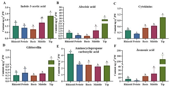 Comparison of the content of major phytohormones in different parts of S. japonica. (A) Indole-3-acetie acid. (B) Abscisic acid. (C) Cytokinins. (D) Gibberellin. (E) Aminocyclopropane carboxylic acid. (F) Jasmonic acid. According to Duncan’s multiple range test, different letters indicate significant differences between the means of different parts (p < 0.05).