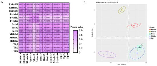 Overview of integrated metabolic data detected in S. japonica. (A) Pearson correlation of integrated metabolic data. (B) Principal component analysis of integrated metabolic data.