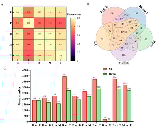 Analysis of DEGs. (A) The sample correlation heat map in the R, P, B, M, and T of S. japonica. (B) Venn diagram of DEGs from different parts of S. japonica. The numbers in the figure represent the number of DEGs. (C) Number of DEGs from R vs. P, R vs. B, R vs. M, R vs. T, P vs. B, P vs. M, P vs. T, B vs. M, B vs. T, and M vs. T. The numbers in the figure represent the number of DEGs.