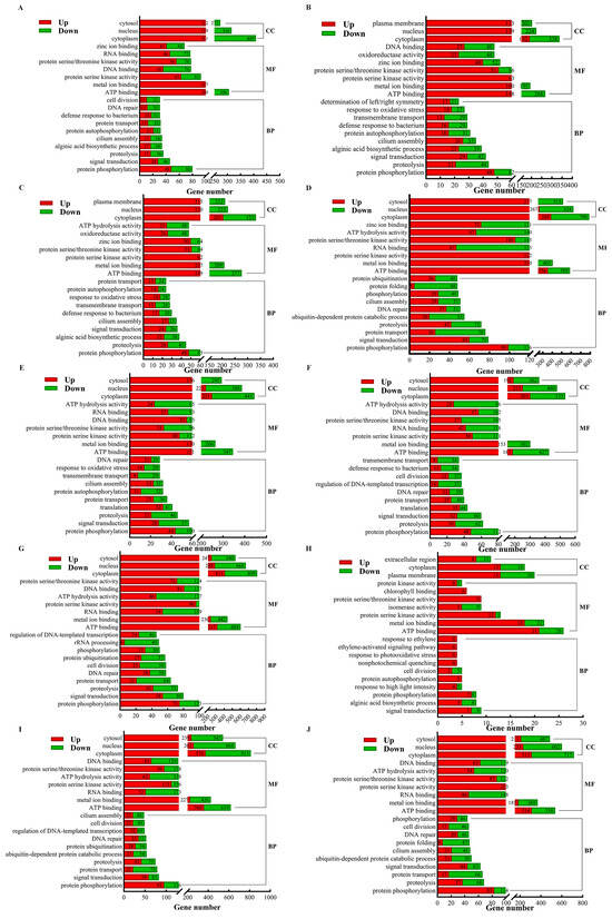 GO annotation classification maps of DEGs from comparison between different parts in S. japonica. (A) R vs. P. (B) R vs. B. (C) R vs. M. (D) R vs. T. (E) P vs. B. (F) P vs. M. (G) P vs. T. (H) B vs. M. (I) B vs. T. (J) M vs. T. CC: cellular component; MF: molecular function; BP: biological regulation.