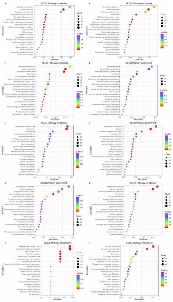 KEGG pathway enrichment analysis of DEGs from comparison between different parts in S. japonica. (A) R vs. P. (B) R vs. B. (C) R vs. M. (D) R vs. T. (E) P vs. B. (F) P vs. M. (G) P vs. T. (H) M vs. T. (I) B vs. M. (J) B vs. T.