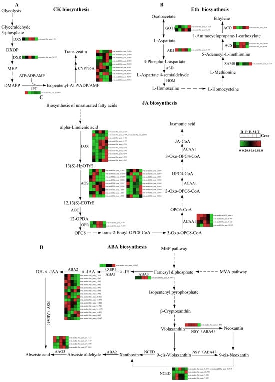 To gain deeper insight into the expression patterns of differential genes within the phytohormone biosynthesis pathway, they were visualized using heatmaps. A comprehensive exploration was undertaken of four phytohormone synthesis pathways (CTK, ethylene, JA, and ABA) that currently possess a higher degree of resolution, with the relevant metabolites partially present in S. japonica. These heatmaps were further integrated with the KEGG pathway to construct gene heatmaps for the phytohormone biosynthesis pathway (Figure 9A–D).