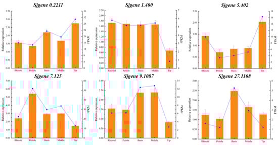 Expression comparison of RT-qPCR and transcriptional analysis of six genes in R, P, B, M, and T from S. japonica. The broken line represented gene expression data obtained from a transcriptome sequencing analysis, while the column depicted the gene expression date from RT-qPCR.