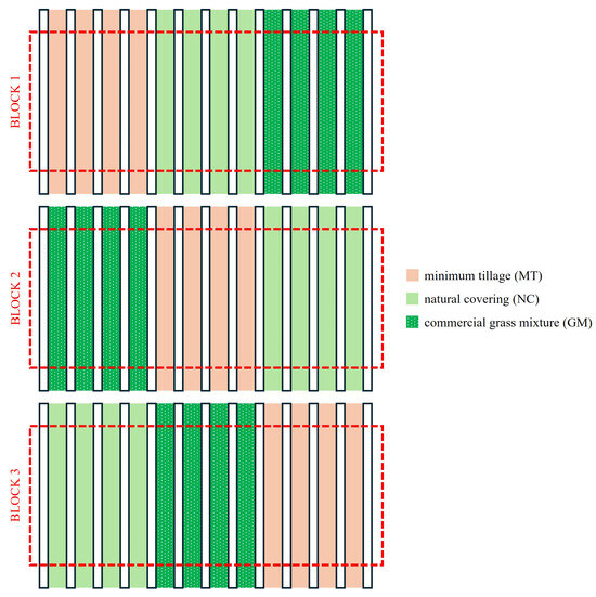 This study was conducted in an experimental vineyard of approximately 1 ha divided into three randomized blocks, each 56 m wide and 54 m long. Each block was divided into three plots (Figure 1). The under-row was kept free of vegetation through chemical weed control over a width of 70 cm (1–2 applications per year with Glyphosate®), using shielding bars to prevent damage to the vines. The inter-row area has been subjected to different soil management practices (Figure 2) since 2014, including (i) periodic minimum tillage (MT), performed using a milling machine and a harrow twice per year (early spring and early summer); (ii) spontaneous natural covering (NC), with mowing repeated 3–4 times per year, allowing for the selection of naturally occurring grass species with high regrowth and tillering capacities while controlling their development, and (iii) a commercial grass mixture cover crop with low-growing grasses (45% Festuca ovina L., 12% Festuca rubra L., 24% Poa pratensis L., and 19% Agrostis tenuis Sibth.), which required three mowings per year. Starting from 2016, each year in spring, the inter-row was fertilized with 30 kg N/ha using ammonium nitrate or urea. The plots were plowed to a depth of 25–30 cm during the first three years after planting. After that, with the establishment of the different soil management practices, only superficial tillage (5–8 cm) was carried out in the tilled inter-rows, using discs, tine harrows, or small plows. In the other inter-rows, spontaneous herbaceous species were allowed to grow naturally; they were mowed twice a year, with the grass left in place.