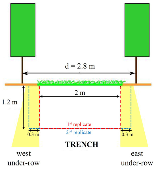The investigations involved inter-rows located in the center of each plot and subjected to different soil management practices, with measurements repeated in two blocks approximately 150 m apart along a gentle slope. At the beginning of spring, during the bud burst phase, when leaf photosynthetic activity and rhizodeposition were limited, a trench was opened in each inter-row, reaching a depth of at least 1–1.20 m and being approximately 2 m wide and 0.50 m long, ensuring that the area closest to the trunks was also affected (Figure 3).