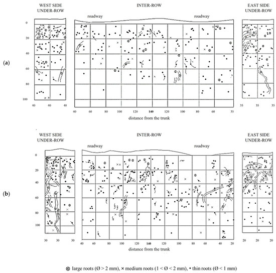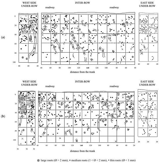Map of soil depth and grapevine radical distribution registered in plots subjected to natural covering (NC). (a) First replicate; (b) second replicate.