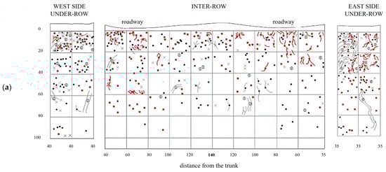 NC soil profiles are shown in Figure 7. The vine roots are numerous and concentrated in the superficial layers of the inter-row, between 10 and 50 cm in depth. In the westernmost portion of the inter-row, 40–50 cm from the vine, there is a greater concentration of large roots (diameter greater than 2 mm) and a sparse presence of fine roots. On the eastern side of the inter-row, also at 40–60 cm from the vines, a high root density was observed, with a marked prevalence of fine roots. In the under-row on the west side, the root quantity is high at all depths, although the highest distribution is recorded in the first 20 cm with a high presence of large roots. In the under-row on the east side, no large roots were observed, and medium and fine roots uniformly colonized the first 40 cm of soil, followed by a reduced exploration of deeper layers.