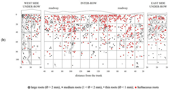 In the under-row, the root systems of herbaceous plants developed mainly within the top 40 cm of soil, although they occasionally reached depths of up to 100 cm, particularly on the east side, where grapevine roots were less abundant (Figure 6). Similarly, in the inter-row space—periodically tilled since vineyard establishment—herbaceous roots were also primarily concentrated in the upper 40 cm. However, due to the repeated tillage that limited weed development, herbaceous roots were overall scarcely present even in the surface layers. Moreover, tillage also restricted their growth in the deeper soil horizons, where only a few roots were observed.